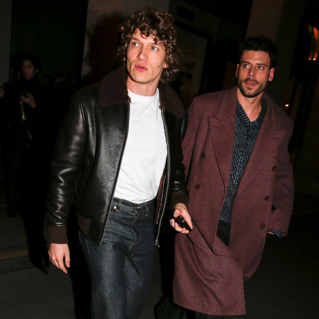 In what could be read as a tentative first step into couple’s dressing, Arnaud wore a double-breasted wool coat layered over a chunky V-neck knit, wide-leg trousers and lace-up boots, while Storrie gave his best James Dean in a leather aviator jacket, a white T-shirt, high-waisted jeans and ankle boots. “What you see across all his looks is that moment when menswear shifted in the ’20s and ’30s, and men started wearing wider legs and more generous cuts on the blazer,” his stylist James Yardley this week told Vanity Fair’s José Criales Unzueta. “When you tie that with his hair, you get this man who you can style from multiple reference points and from different decades, and not with a costume element, because it’s never that, but with a nod to leading men from Hollywood history.” And what does every great leading man in Hollywood have? A rumoured boyfriend.